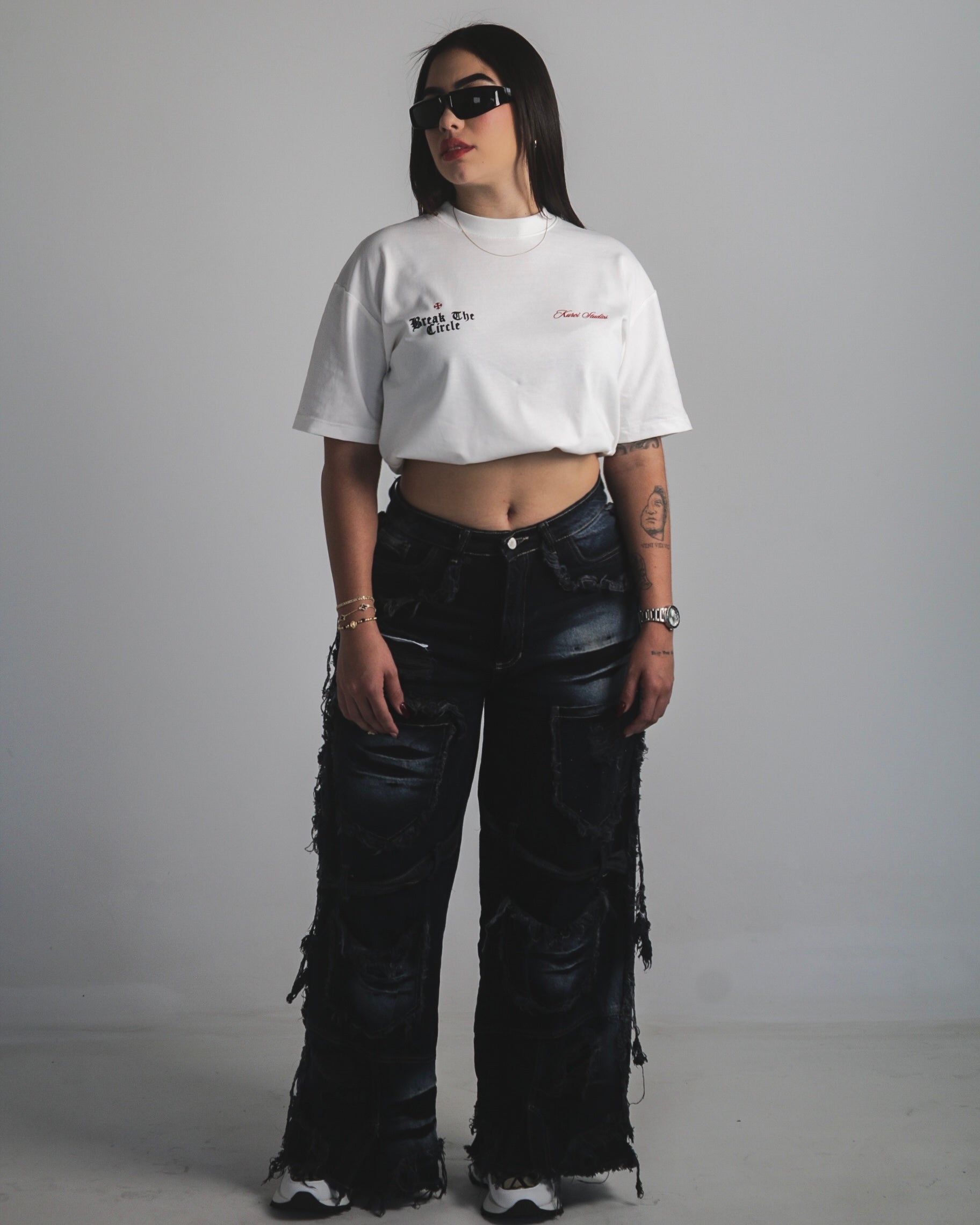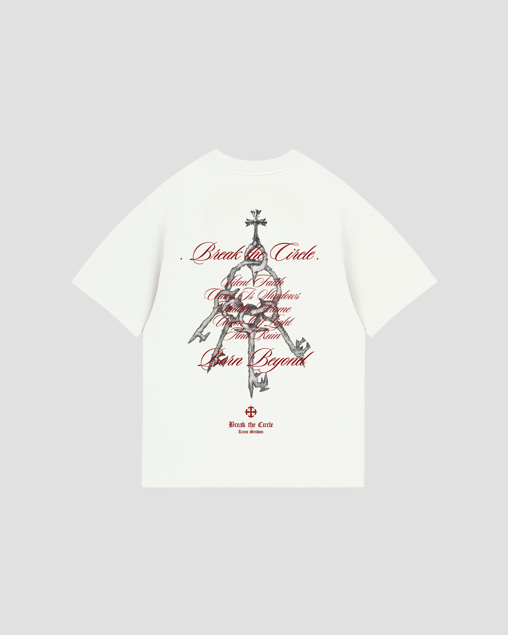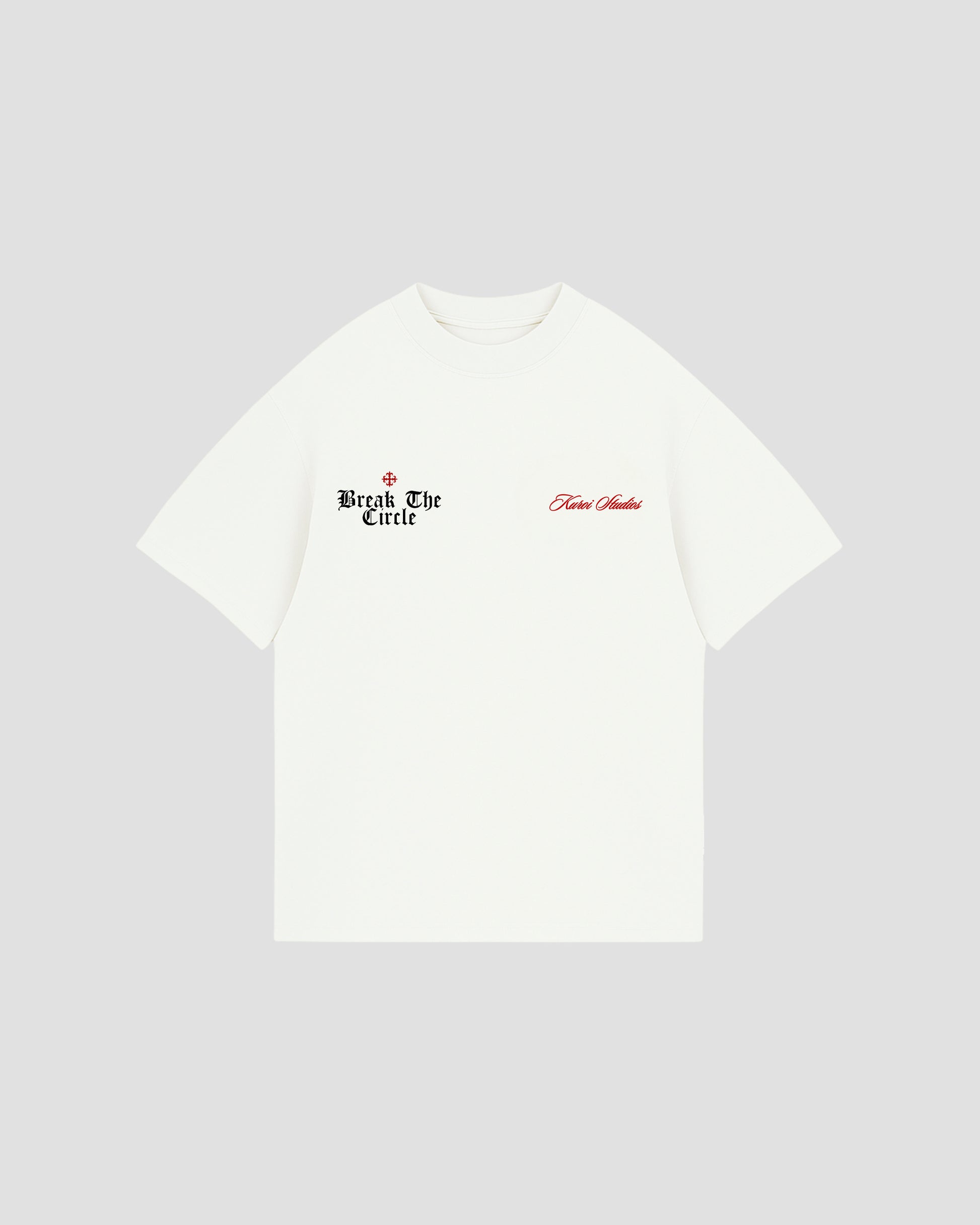 Camiseta Regular Oversize color Ivory, confeccionada en algodón peruano 100% de alto gramaje (250 g). Cuenta con cuello redondo en rib que aporta estructura y durabilidad. Presenta gráficos estampados en pecho y espalda, desarrollados con detalles en alto relieve en color negro y rojo.